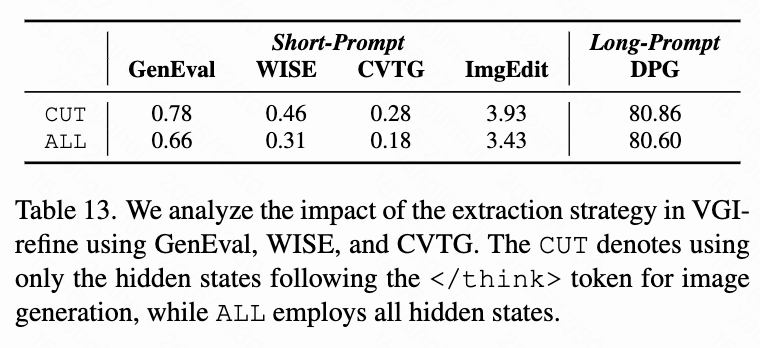 Extraction Strategy in VGI-refine: As shown in Table 13 below, using only the hidden states after the <