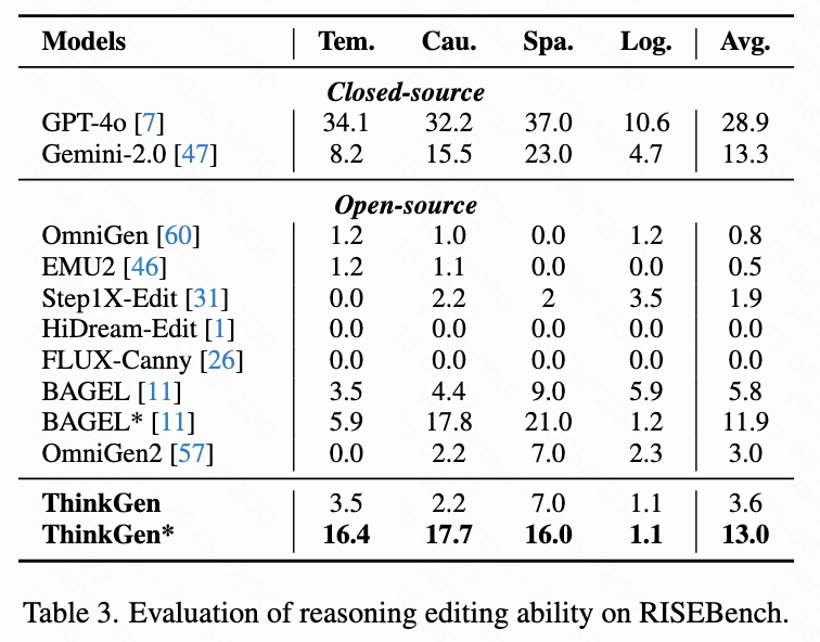 As shown in Table 3 below, on RISEBench, ThinkGen's CoT reasoning ability significantly surpasses that of open-source models (3.6 → 13.0) and achieves results comparable to those of the closed-source model Gemini-2.0.