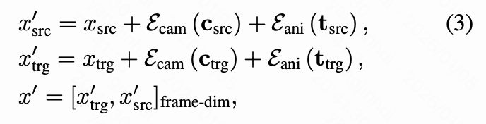Second, they are trained on datasets where the first frames of the source and target videos are always identical. The latter limitation is addressed in this paper's training dataset design. To overcome the former, this paper designs a source-aware camera conditioning approach. This paper uses a pre-trained pose estimator to estimate the camera poses of the source and target videos and jointly injects them into the diffusion model to provide explicit geometric context. Thus, Equation (2) is extended as: