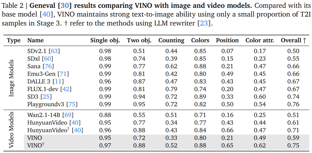 Preservation of Basic Capabilities: Despite the small proportion of standard text-to-image/text-to-video data in Stage 3, VINO's performance metrics on the Geneval and VBench benchmarks are highly comparable to those of the HunyuanVideo backbone network, proving that the training strategy effectively avoids catastrophic forgetting.