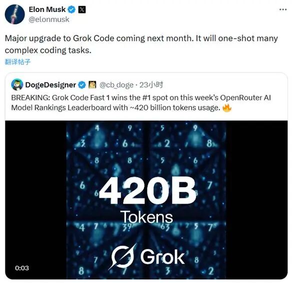 Elon Musk announced yesterday that xAI will release a significant update to its programming reasoning model, Grok Code, next month. The new version will enhance programming capabilities for complex scenarios.