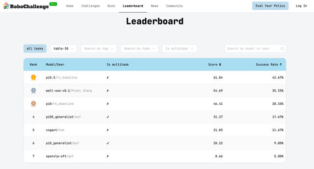 Recently, the RoboChallenge leaderboard—a benchmark testing platform for large-scale, multi-task real-world performance—has been updated, with pi0.5, WALL-OSS, and pi0 taking the top three spots.