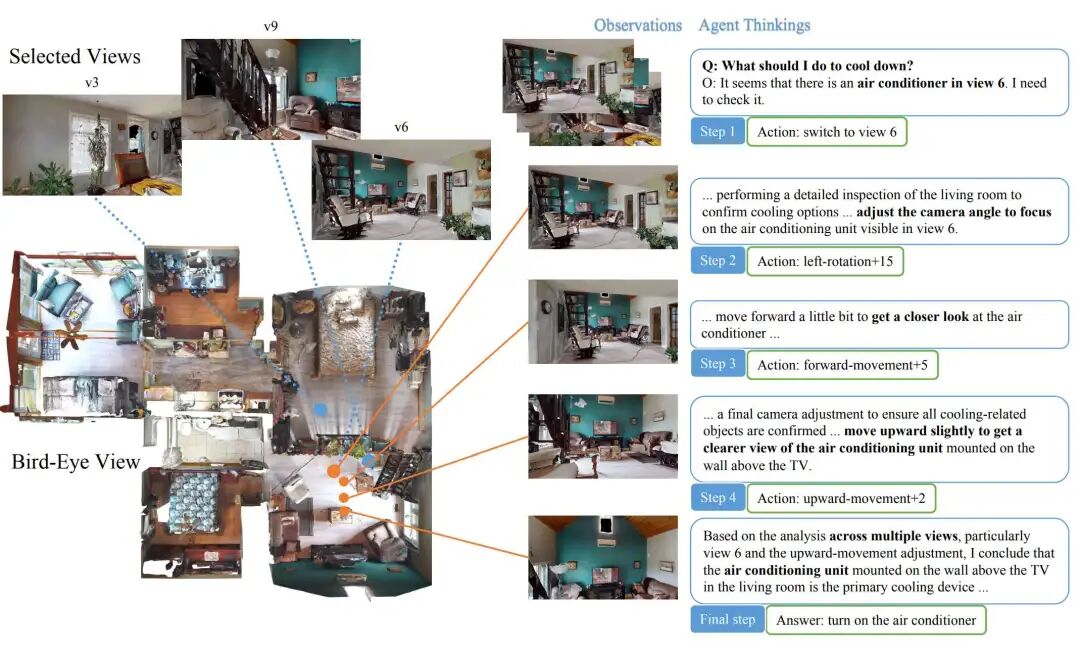 Inspired by the Chain of Thought (CoT) methodology, researchers propose a fine-grained viewpoint adjustment mechanism. This approach dynamically supplements the model with environmental information relevant to the question, enabling the agent to progressively approach the answer through sustained observation and contemplation. Based on the visual anchors identified during coarse-grained selection, the VLM plans and executes a series of viewpoint adjustment actions, including panning, rotating, and switching between viewpoints.