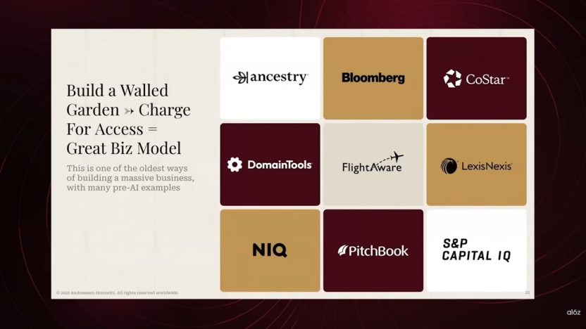 I strongly encourage everyone to pay attention to the so-called Walled Garden and its outcomes. This refers not just to creative archives but also to logistics information and even data in county recorder's offices. For example, you can find out who owns which property, but this information typically requires an in-person visit to the offline office. Although this information is essentially free, if you can digitize it, make it easily accessible, and add value through AI on top of it, the product you create will far exceed the value of the data itself.