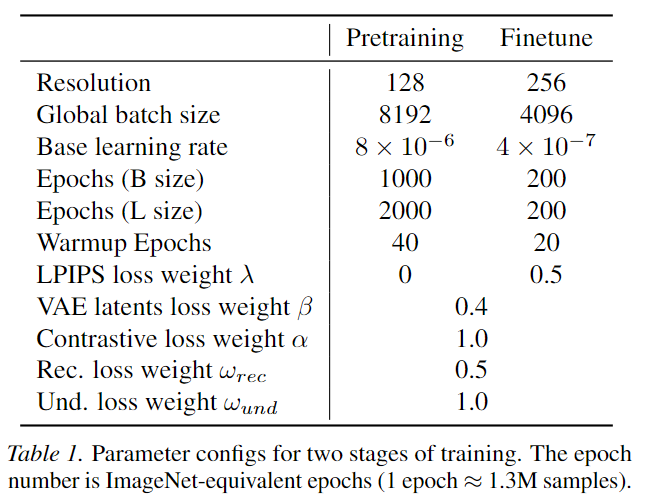 Training Details: As shown in Figure 1, a pre-trained FLUX.1 VAE is used and frozen throughout the entire training process. All other components (including the ViT encoder, ViT decoder, text encoder, text decoder, and linear layer) are randomly initialized and remain unfrozen throughout training. For both training phases, the global batch sizes are 8K and 4K, respectively, with base learning rates adopting cosine decay set to [learning_rate_low] and [learning_rate_high]. Detailed parameter configurations are provided in Table 1. The model is trained on the DataComp dataset, which has been re-annotated by LLaVA-Llama-3, ensuring high-quality training data.