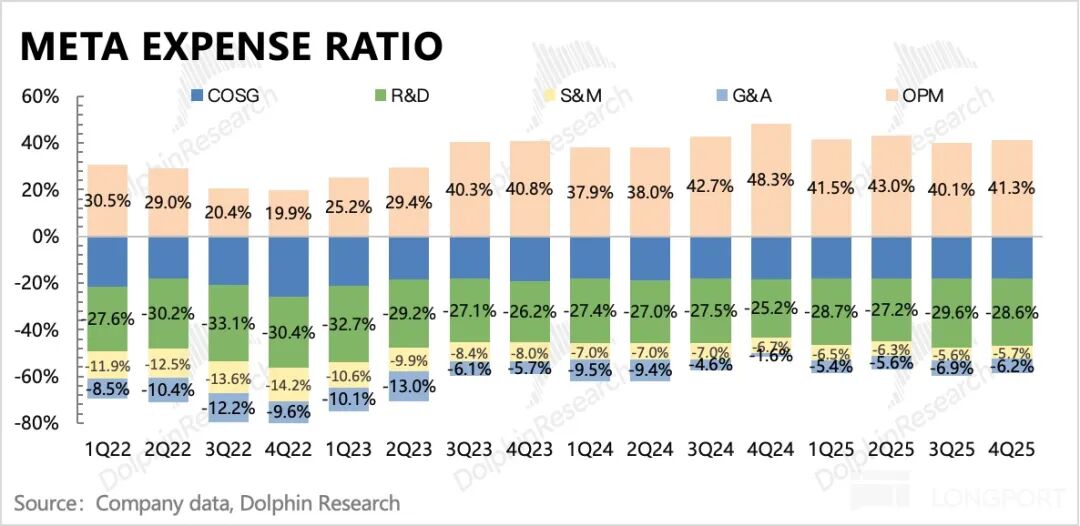 Specifically, R&D expenses increased by 41%, while administrative expenses surged due to legal expenses, personnel costs, fines, and other factors. Although the final revenue growth was impressive, the profit of $23.7 billion only saw a year-on-year increase of 4.9%. According to Dolphin Research's estimates, it is expected to further impact profit margins by 5 - 6 percentage points in 2026.