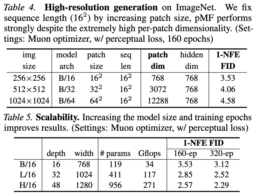 High-Resolution Generation: In Table 4, this study investigates pMF at resolutions of 256, 512, and 1024. By increasing the patch size (e.g., ) to maintain a constant sequence length (), it results in an exceptionally large patch dimension (e.g., 12288). The results demonstrate that pMF can effectively manage this highly challenging scenario. Even though the observation space is high-dimensional, the model consistently predicts , whose latent dimension does not scale proportionally.