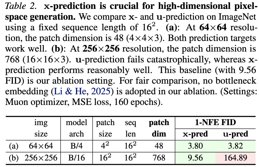 256×256 Resolution: The patch dimension is 768 (). This leads to a high-dimensional observation space, posing a greater challenge for neural networks to model. In this scenario, only -prediction performs satisfactorily (FID 9.56), suggesting that lies on a lower-dimensional manifold and is hence more amenable to learning. Conversely, -prediction suffers a catastrophic failure (FID 164.89): as a noisy quantity, has full support in the high-dimensional space, complicating its modeling.
