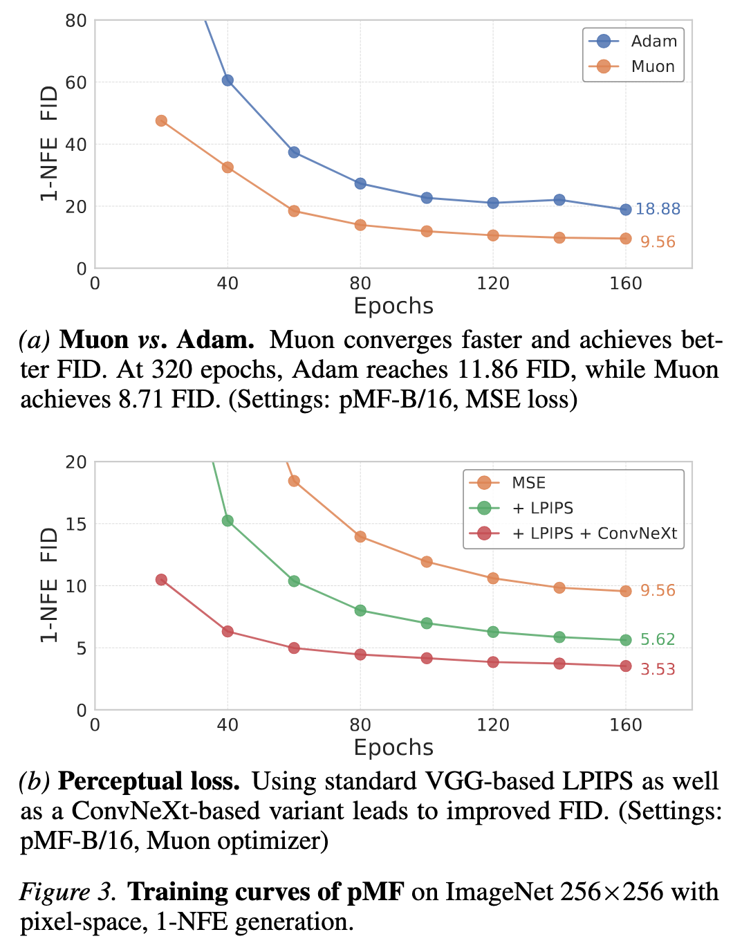 Optimizer: This study identifies that the choice of optimizer significantly impacts pMF. In Figure 3a, the standard Adam optimizer is compared with the recently proposed Muon. Muon demonstrates faster convergence and a substantially improved FID (from 11.86 to 8.71). In a one-step generation setting, the advantage of faster convergence is further accentuated, as a superior network provides a more precise stopping gradient target.