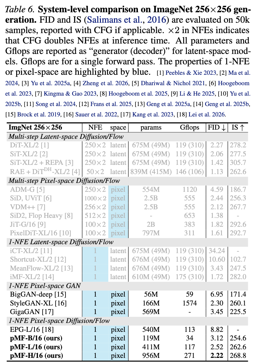 These results indicate that one-step pixel-level generation models have become highly competitive while eliminating the need for additional decoder overhead (which accounts for significant computational costs in latent space models).