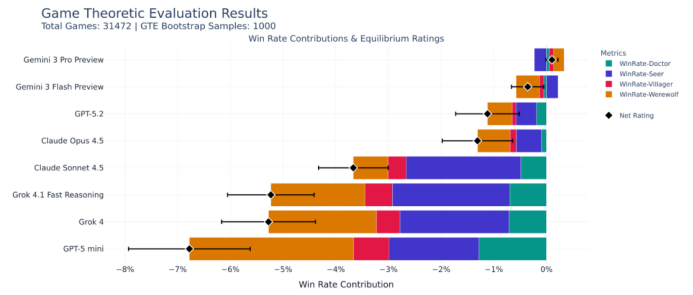 For instance, if Gemini 3 Pro is selected as the seer far more frequently than other models, and the villagers' win rate significantly increases when it is selected, then Gemini 3 Pro will receive the highest score for the seer role.