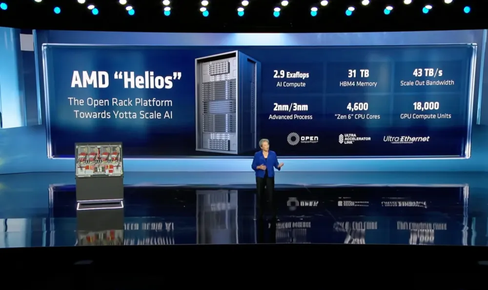 The Helios rack will support up to 72 MI455X GPUs, achieving efficient cross-GPU and cross-rack collaboration through "43TB/s horizontal scaling bandwidth" (ultra-Ethernet technology) and "full liquid cooling design," delivering a single-rack AI compute power of 2.9 ExaFLOPS (FP4).