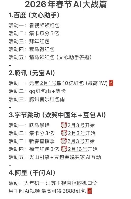 On the surface, the upcoming Spring Festival sees the four AI platforms taking different paths, but their goals are surprisingly aligned: during the critical window of AI application explosion, they aim to seize the super entry point for the next-generation internet using the familiar tactic of “burning money to capture the market.”