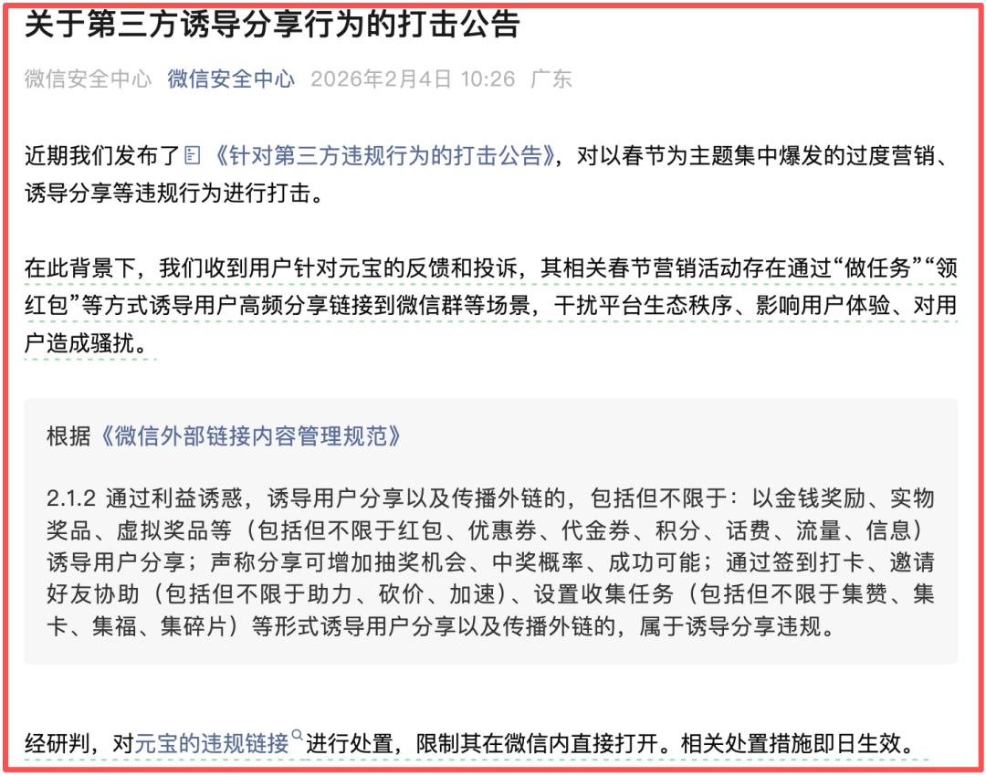 However, as the campaign's popularity surged, related issues emerged. On February 4, WeChat's Security Center announced that it had received user feedback and complaints about Yuanbao, noting that its Spring Festival marketing activities involved Inducing Sharing (inducement to share) through methods like “completing tasks” and “receiving red envelopes,” which disrupted the platform's ecosystem, impacted user experience, and caused harassment (harassment) to users.