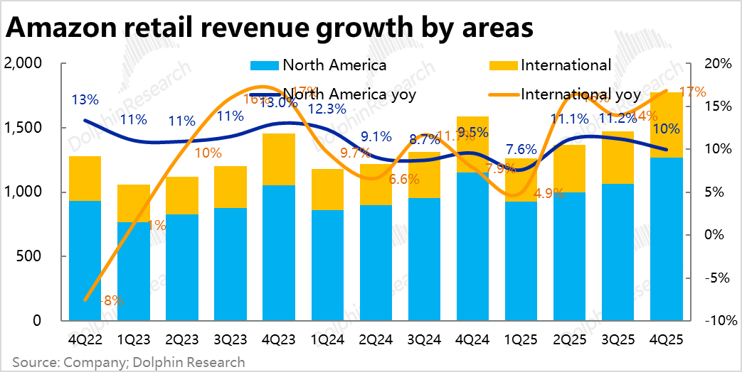 Most critically, AWS growth accelerated by nearly 4 percentage points as expected. While the market had fully anticipated this, the actual performance still slightly exceeded expectations. Traditional general retail, while not dazzling, at least grew steadily with margins continuing to rise. Thus, on a standalone basis, this quarter's performance had few flaws.