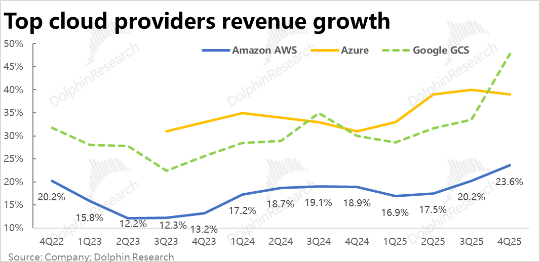 When compared horizontally with the other two major cloud service providers, Azure is slowing down & AWS is accelerating. Previously, Amazon's gap in AI capabilities and business with its peers was indeed narrowing.