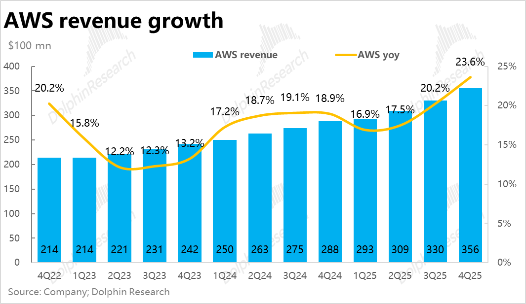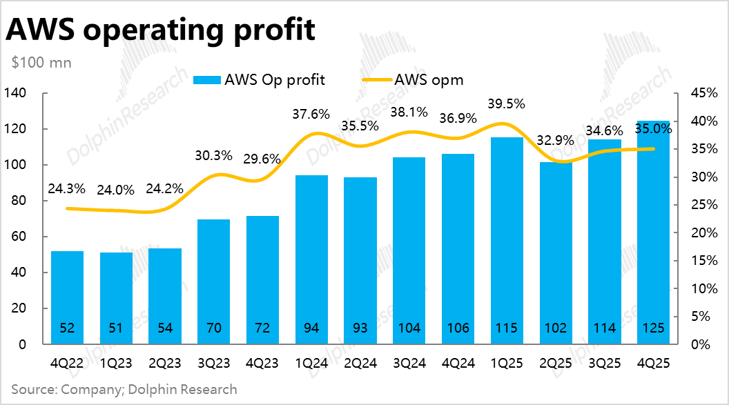 Meanwhile, AWS's operating profit margin for the quarter increased to 35% instead of decreasing, up 0.4 percentage points (pct) quarter-over-quarter (QoQ), with the year-over-year (YoY) decline also continuing to narrow, significantly better than the Bloomberg consensus of 34.3%. It seems that it has not been particularly affected by the increase in Capex and the drag of generally lower gross margins in AI businesses compared to traditional businesses.