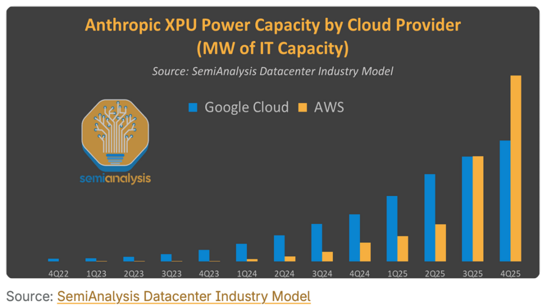 The reason Anthropic's collaboration has not yet significantly boosted AWS growth—apart from Anthropic's smaller scale and lower compute requirements compared to OAI—is, according to Semi Analysis, that Anthropic previously relied more on GCP, only shifting heavily to AWS in Q3-Q4 2025.