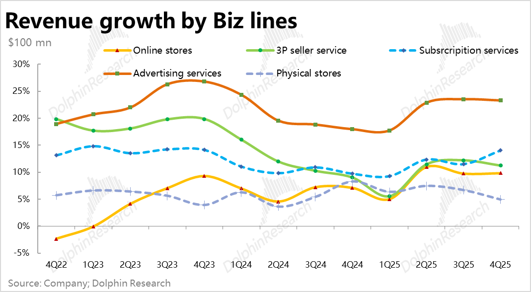 b. Advertising revenue growth remains strong at 23.3%, the highest among the pan-retail business lines. Combined with previous reports, the increase in advertising on other Amazon multimedia content, such as Prime Video, should be the main driving force.