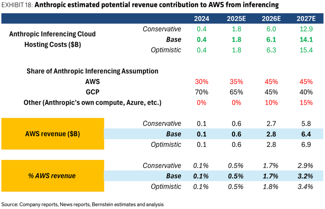 These include: a. Anthropic extensively using Trainium and Inferentia chips for model training and daily inference. Amazon's Project Rainier, built for Anthropic, is expected to reach 2.2GW in total capacity, potentially generating about $14 billion in annualized revenue for AWS at full production;