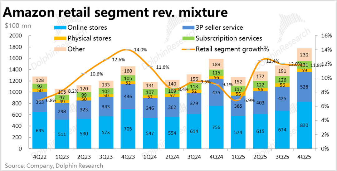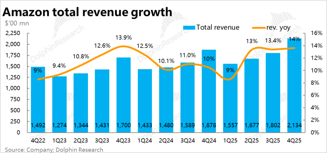 Combining all businesses, Amazon's total revenue for the quarter was $213.4 billion, up 13.6% YoY, slightly accelerating and slightly higher than market expectations. Excluding the impact of favorable exchange rates, the actual growth rate was roughly flat QoQ at 12%.