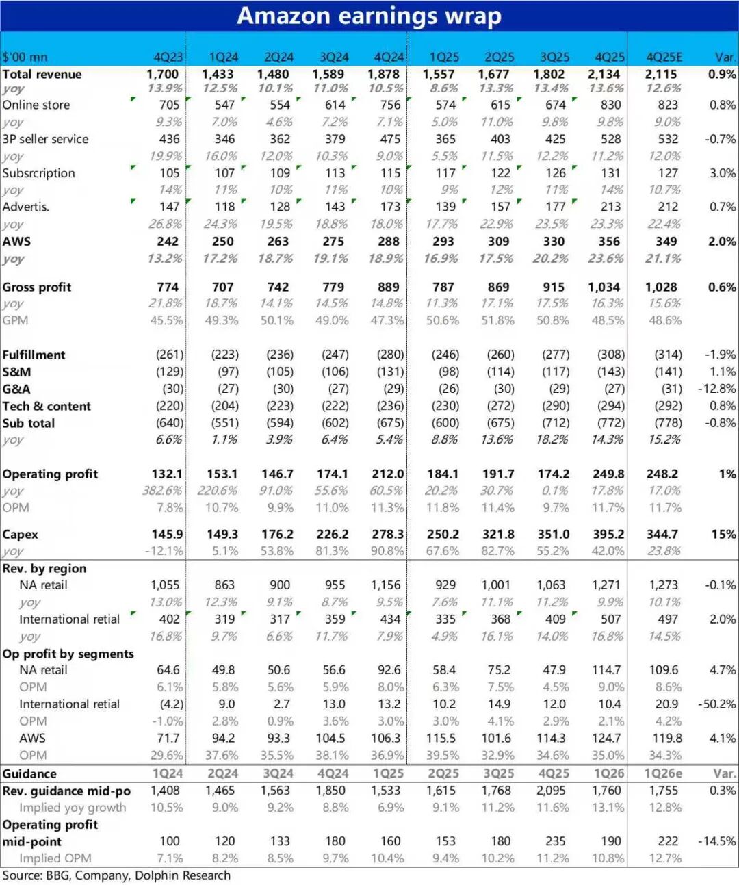 Amazon released its Q4 2025 earnings report after the U.S. stock market closed on the morning of February 6th, Beijing time. Overall, the quarterly performance was solid, with minor flaws, but both total revenue and operating profit slightly surpassed expectations. Core AWS growth also accelerated significantly as anticipated, yet the market's reaction was familiar—despite a strong quarter, the stock still plunged. Here are the details:
