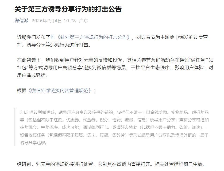 On February 4th, numerous users found that Yuanbao red packet links in WeChat groups triggered system warnings about "inducive sharing content," necessitating copying to a browser for access.