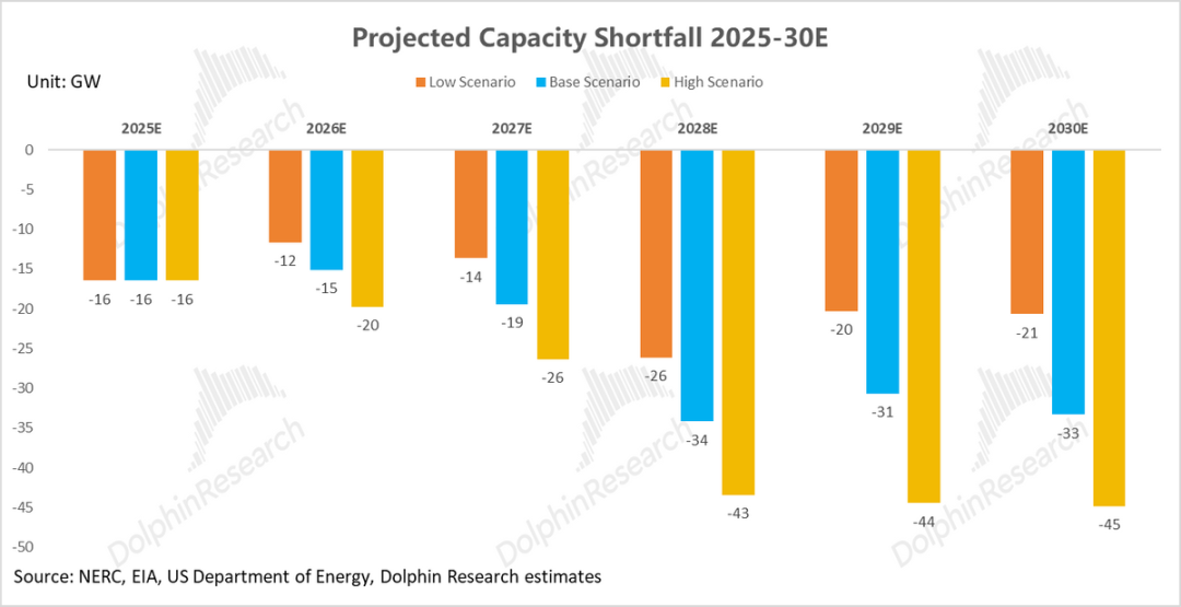 Assuming the system reserve margin remains the same as in 2024 (15%), and considering the explosive growth in AI-related load on the demand side, Dolphin Research predicts that by 2030, the U.S. power system will face a significant reliability shortfall. The estimated gaps under low, medium, and high-demand scenarios are expected to reach 109GW, 149GW, and 195GW, respectively.