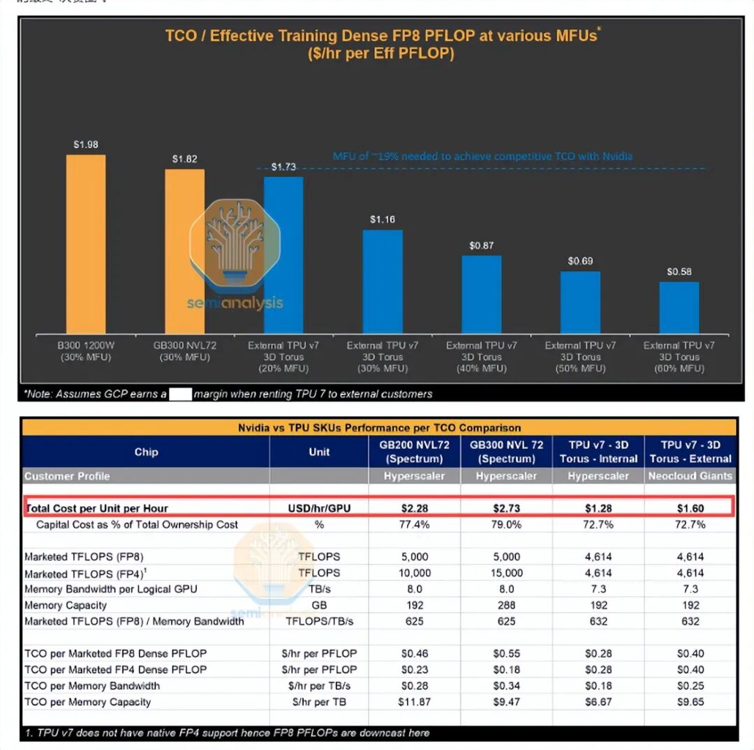 However, with the penetration of self-developed chips such as Google TPU in inference and specific training scenarios, costs will significantly decrease. TPU V7 not only has a 41% lower total cost of ownership (TCO) per unit of computing power than GB300 but also has advantages in energy consumption and cooling, which are expected to reduce its capital expenditure (Capex) to half of that of GPU solutions (approximately USD 27.5 billion/GW).