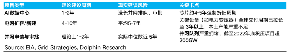The theoretical construction time for AI data centers is only 18-24 months, while the expansion of matching (supporting) transmission networks and cross-regional lines, constrained by permitting approvals, environmental assessments, and the delivery of long-lead equipment (such as transformers), often takes 5-7 years or even longer.