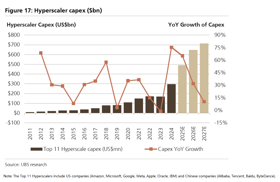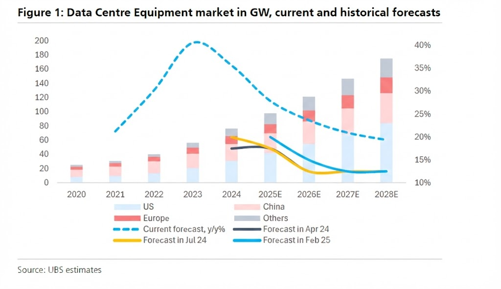 According to UBS data, by the end of 2025, the global operational capacity of data centers will be 105 GW, with 25 GW under construction and over 100 GW in the planning phase.