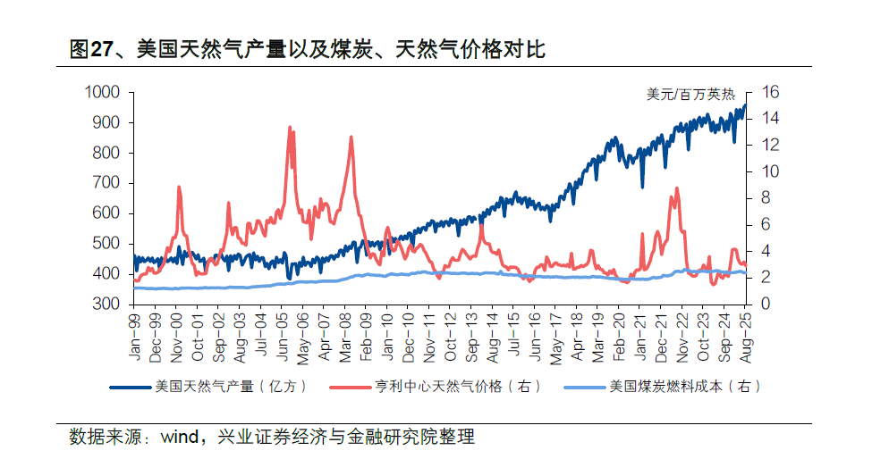 Natural gas shifting from peaking energy to a 'ballast stone': Thanks to the cost advantages brought by the U.S. shale gas revolution and its scheduling flexibility, as well as its relatively better cleanliness compared to coal-fired power, the installed capacity of natural gas power generation has steadily increased, and its share has remained stable at over 40% for a long time, making it the main power source.