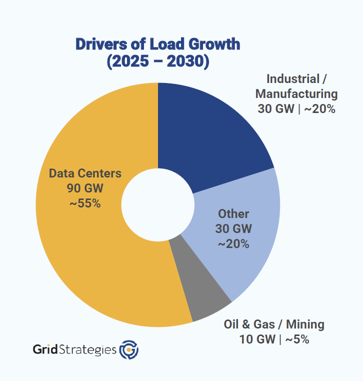 b. Followed by industrial/manufacturing reshoring (an additional 30 GW) and end-use electrification (an additional approximately 30 GW, primarily driven by residential electrification—such as heating heat pumps and electric vehicle facilities);