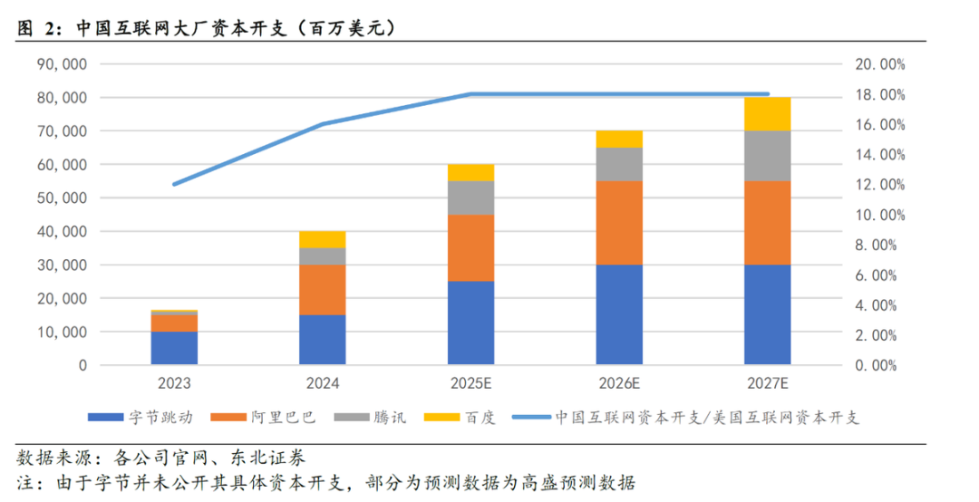 Meanwhile, although Chinese internet giants (BAT + ByteDance) are limited by chip supply and have a smaller investment scale compared to U.S. giants (estimated at approximately $60 billion in 2025), they still constitute another important growth pole in global AI infrastructure.