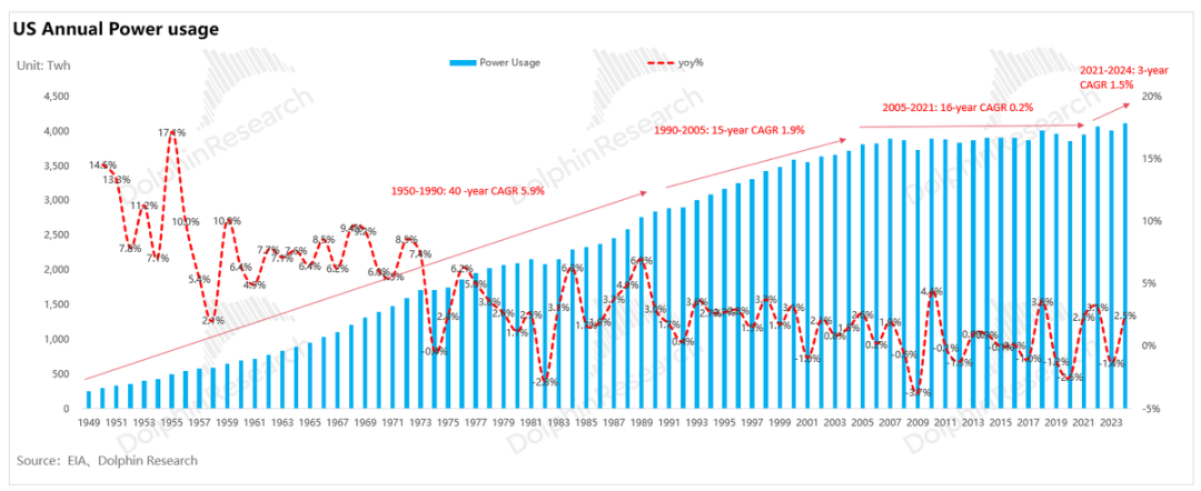 Throughout U.S. power development history, end-use electricity demand has exhibited a distinct three-stage evolution: 'growth-plateau-recovery'":"Rapid Growth Period (1950s-1990s): Driven by post-war economic prosperity, heavy industrialization, and residential electrification (e.g., air conditioners and home appliances), U.S. electricity load maintained high growth (CAGR of 6%).