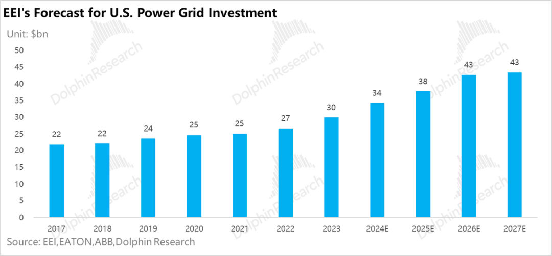 Due to slow growth in U.S. electricity consumption after 2000, the hollowing-out of the domestic power equipment manufacturing industry (with key components such as transformers highly dependent on imports and facing a shortage of skilled technicians), and the fragmented ownership of the U.S. grid (primarily privately owned), grid investment in the U.S. has remained at a low level for a long time (averaging about $20-30 billion annually over the past decade, only surpassing $30 billion in 2024).