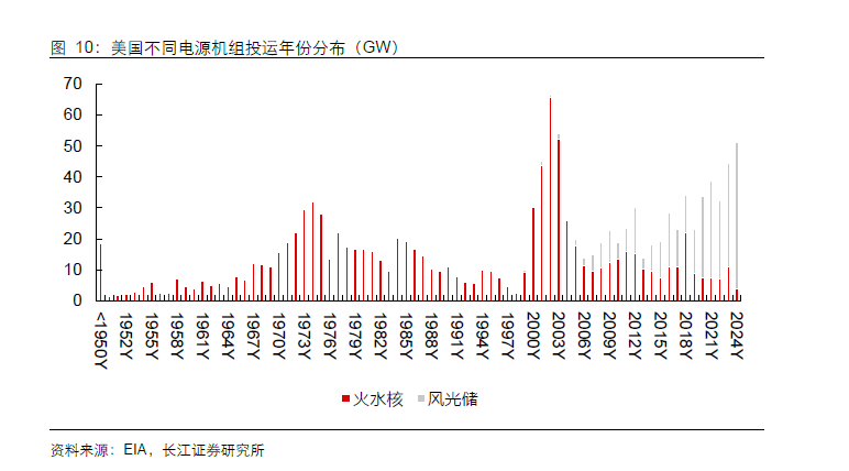 'Aging' Crisis: 528 GW (accounting for over 50%) of high-quality base load sources (thermal, hydro, and nuclear) have been in service for more than 30 years, leading the United States to enter a peak period of thermal power retirement since 2010. More severely, according to EIA forecasts, from 2020 to 2030, the retirement volume of base load units will exceed their new additions every year, meaning that before the AI demand explosion, the system's 'reliable capacity' has been continuously net losing.
