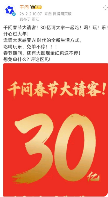 According to QianWen App's official Weibo account, the 'QianWen Spring Festival Hospitality Plan' will officially commence on February 6, emphasizing 'Free Eats, Drinks, and Entertainment Non-Stop,' along with substantial cash red packets.