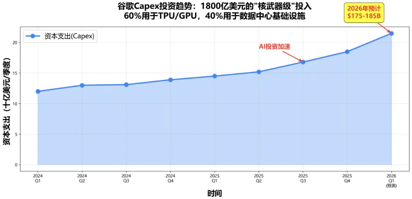 Data shows that in Q4 2025, Google's capital expenditures reached $27.9 billion, nearly doubling from $14.3 billion in the same period last year. For the full year of 2025, Google's capital expenditures ultimately reached $91.45 billion, up 77% year-over-year (from $52.5 billion). This calculates to a nearly 100% increase in Google's 2026 capital expenditures.