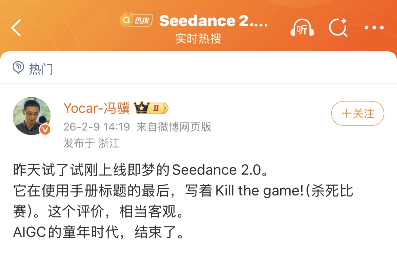 In a detailed analysis specifically about Seedance 2.0, Feng Ji posits that the release of this video model marks the end of "AIGC's infancy."