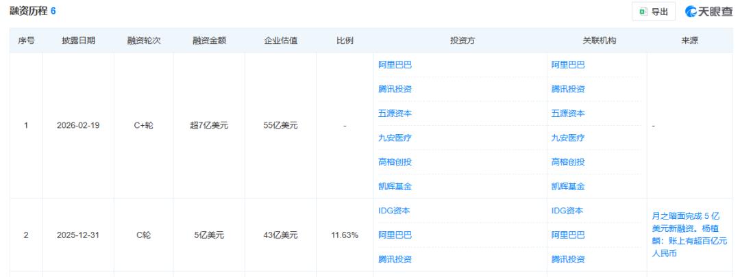 Tianyancha data shows that Alibaba, Tencent, and IDG Capital led Moonshot AI’s $500 million Series C round in December 2025. In February 2026, a new $700+ million Series C+ round was jointly led by Alibaba, Tencent, 5Y Capital, Jiu’an Medical, and Gaorong Capital, with existing investors like Gaorong Capital doubling down. Post-financing valuation exceeded $10 billion.