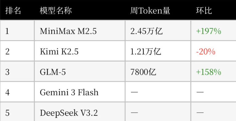 Among them, MiniMax M2.5 topped the list with 2.45 trillion tokens, followed by Kimi K2.5 with 1.21 trillion, while Zhipu GLM 5 and DeepSeek V3.2 ranked third and fifth respectively.