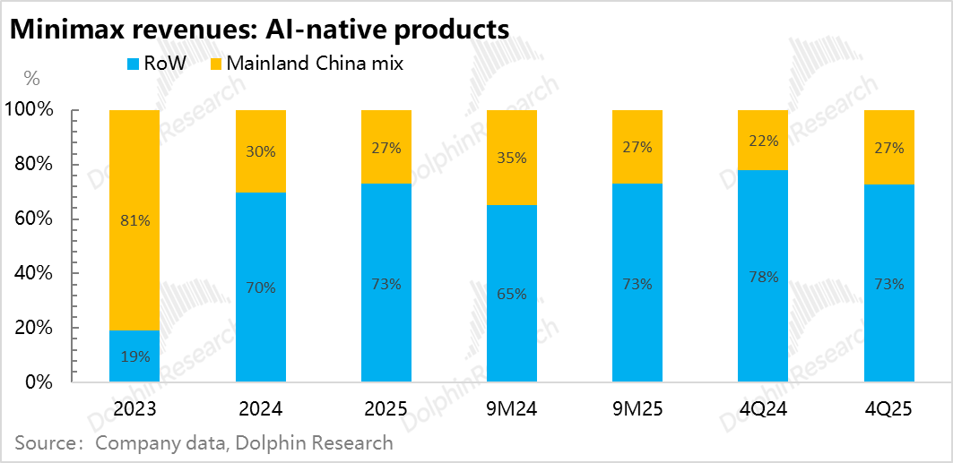 MiniMax's overseas revenue (from the U.S., Singapore, and other regions) is evenly distributed. After rising to 73% in H1, driven by Conch AI, it held steady—no further increase.