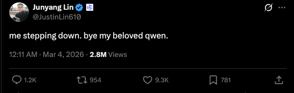 On the morning of March 4th, Junyang Lin, the technical leader of Alibaba's Tongyi Qianwen, announced on X (formerly Twitter) that he would be leaving the Qwen project. The news came as a surprise: Qwen 3.5, which had garnered widespread acclaim in the open-source community, had just been released during the Spring Festival, and a lightweight model had been launched the day before, even earning a like from Elon Musk.