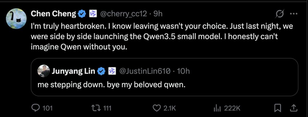 This quickly became one of the most talked-about personnel changes in the AI field—surpassing even the buzz when Zhou Chang, the former head of Tongyi Qianwen, was "poached" by ByteDance in 2024. AI industry media outlets collectively covered the story, while developers from around the world flooded Junyang Lin's X account with comments expressing their gratitude.
