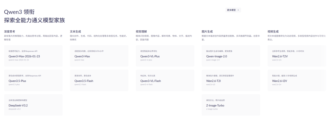 Mainstream models in the Tongyi model family. Source: Alibaba Cloud BaiLian