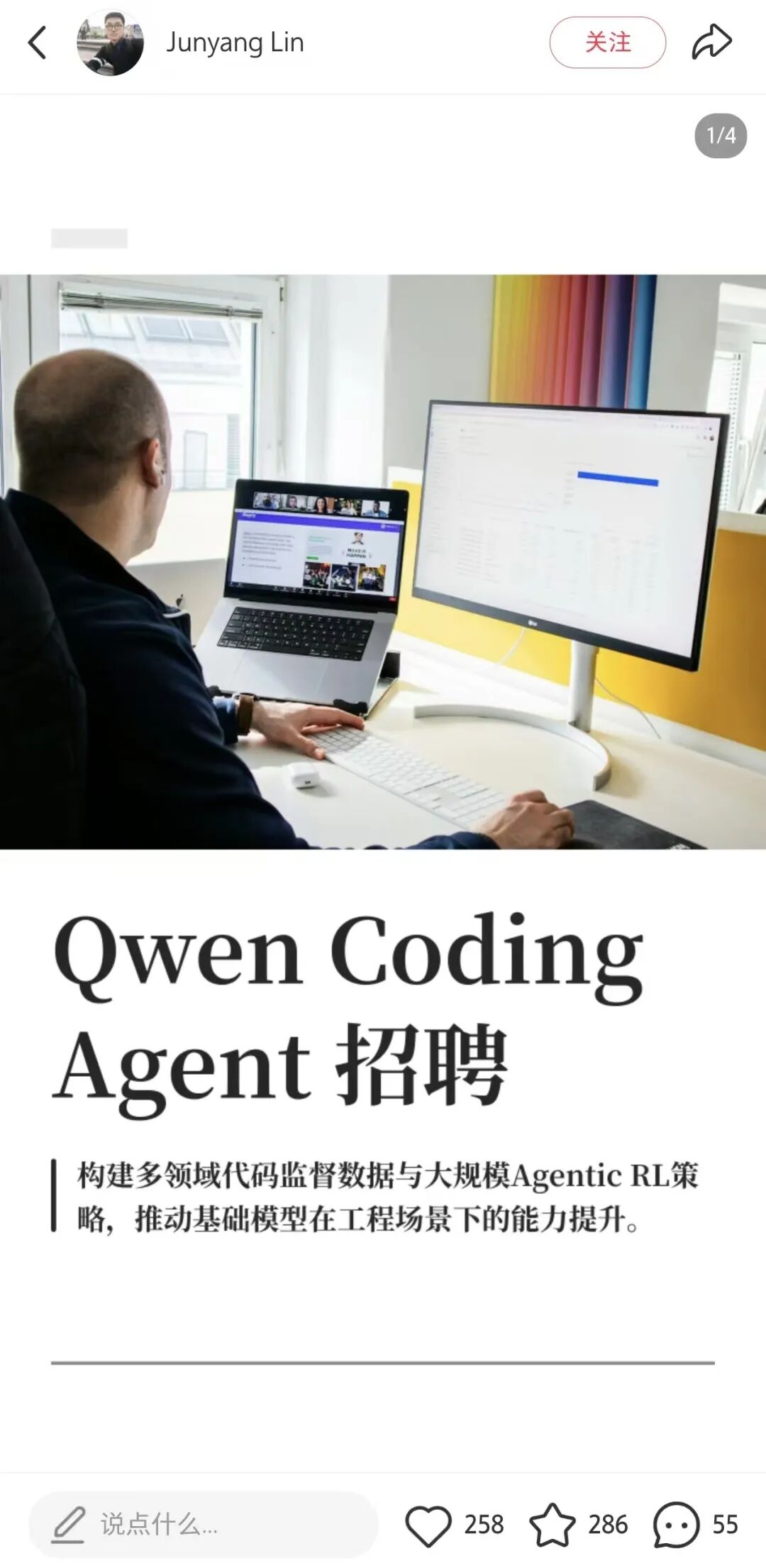 Junyang Lin forwarding the Qwen Coding Agent job posting on Xiaohongshu.
