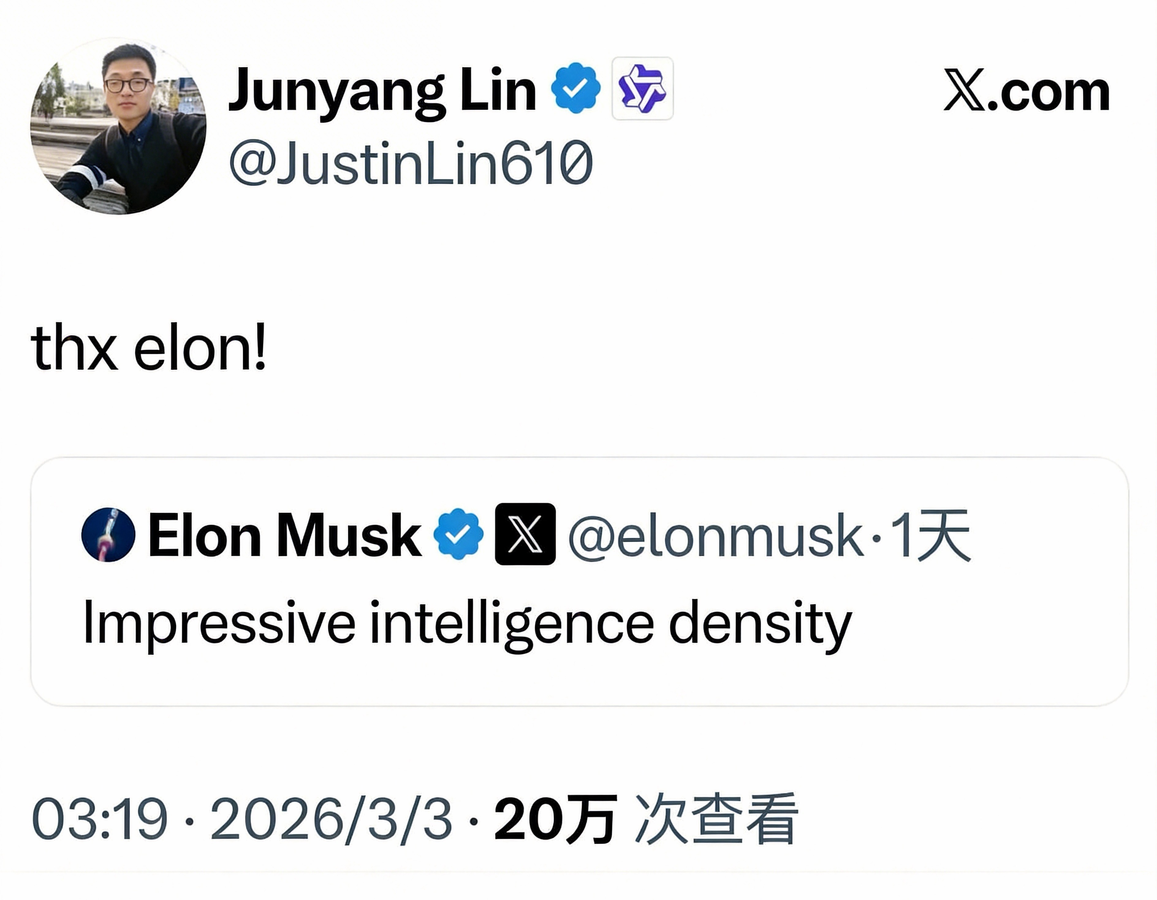 In the preceding 24 hours, the lightweight version of Qwen 3.5 had just garnered public acclaim from Elon Musk for its outstanding performance, with Musk describing its "intelligence density as astonishing." Lin Junyang was still actively engaging on social media, and Qwen was enjoying peak industry attention. Such an abrupt turn of events left the entire AI community reeling.