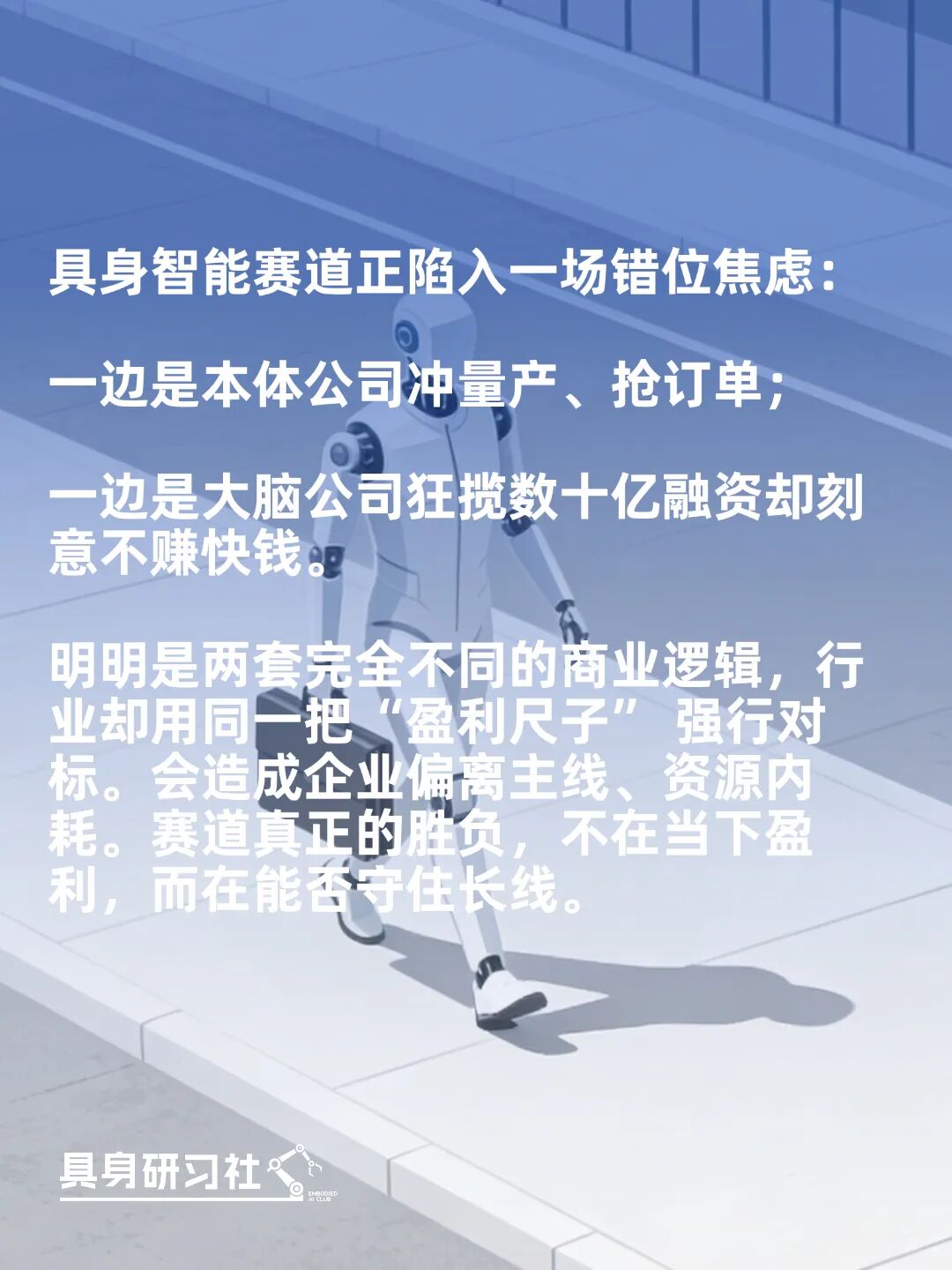 It follows an exponential growth logic: after capabilities cross a certain threshold, the market will rapidly concentrate among a few leading players. Its logical closed loop (translated as ' closed loop ' meaning 'closed loop') is: capability breakthrough - scenario generalization - large-scale implementation - data feedback - further capability breakthrough. Therefore, you will find that short-term imitation of physical entity companies by embodied brain enterprises, such as blindly investing in production, only increases costs. The main task for brain enterprises is to 'save money' and wait for the technological inflection point of the industry.
