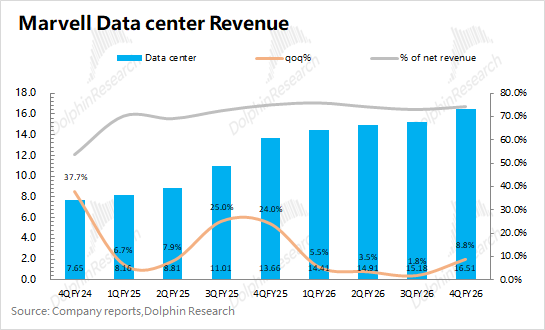 Marvell Technology achieved data center revenue of $1.65 billion in Q4 FY2026, up 8.8% sequentially, meeting market expectations of $1.64 billion. The growth in the company's data center business this quarter was primarily driven by custom ASIC and optical interconnect products.